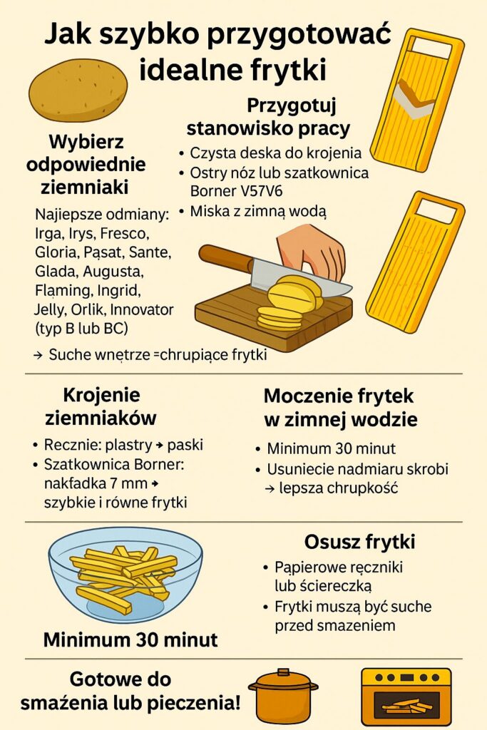 Przygotowanie idealnych frytek zaczyna się od starannego doboru surowca. Wybór odpowiedniej odmiany ziemniaków ma kluczowe znaczenie dla uzyskania idealnej konsystencji i smaku. Najlepsze do smażenia są ziemniaki o wysokiej zawartości skrobi – odmiany typu B – ogólnoużytkowe, takie jak np. Irys, Fresco, Sante, Gala, Augusta, Flaming. Charakteryzują się one suchym wnętrzem, które po obróbce cieplnej daje frytki chrupiące na zewnątrz i miękkie w środku. Unikać należy ziemniaków młodych lub tych o wysokiej zawartości wody, gdyż podczas smażenia stają się one miękkie i nasiąknięte tłuszczem. Przed rozpoczęciem krojenia ziemniaki należy dokładnie umyć, aby usunąć wszelkie zabrudzenia i zanieczyszczenia, które mogłyby wpłynąć na ostateczny smak potrawy. W przypadku odmian o grubej skórce wskazane jest ich obranie, natomiast przy młodszych ziemniakach skórka może być pozostawiona dla dodatkowej tekstury i walorów smakowych.
